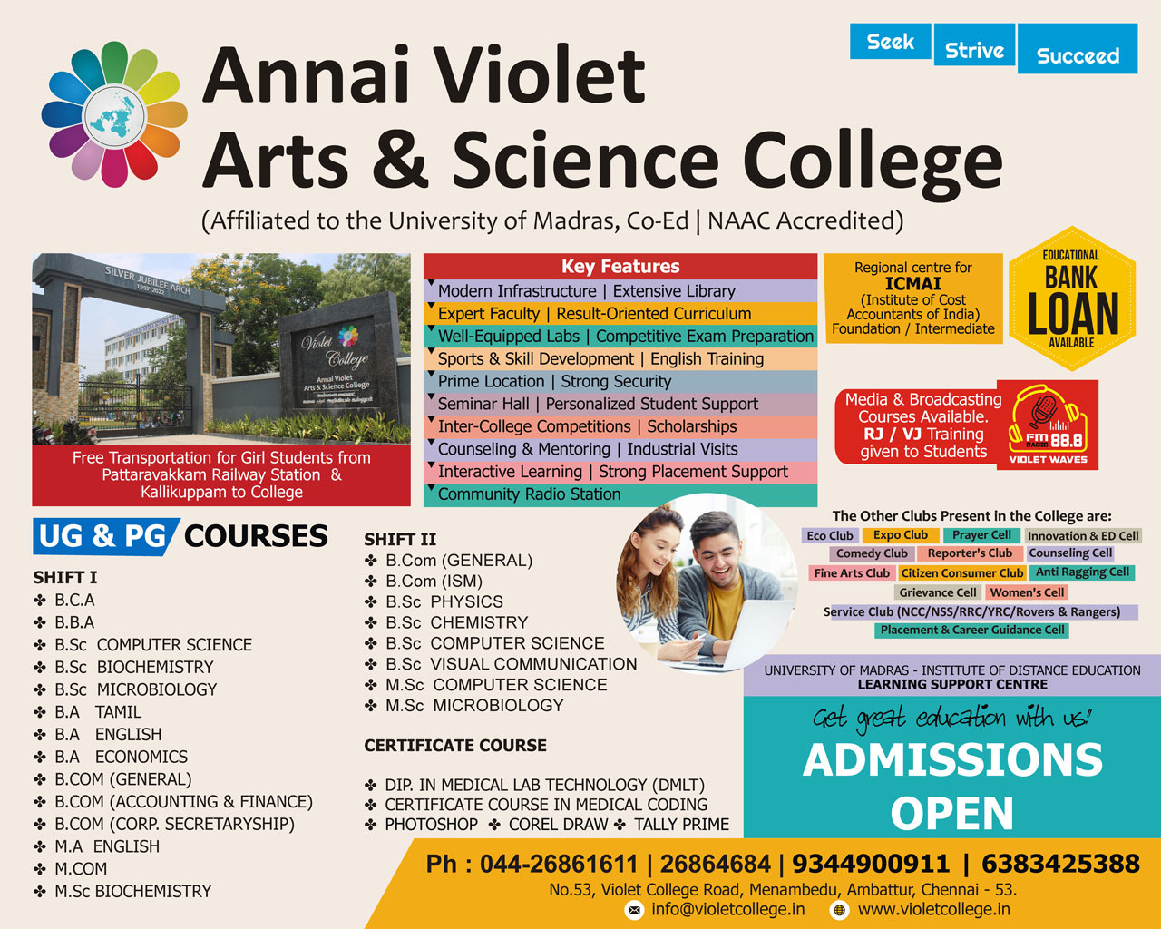 Annai Violet Arts & Science College, a premier institution of higher learning, is dedicated to academic excellence, character building, and holistic development. With a commitment to fostering intellectual curiosity and creativity, the college provides a dynamic environment where students can explore their potential and achieve their aspirations.