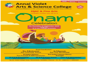 Onam Celebration was organized by the IQAC and Fine Arts Club of Annai Violet Arts & Science College on 4th September 2025, in the college premises with great enthusiasm. The program highlighted the significance of Onam through vibrant performances, traditional elements such as the legend of King Mahabali, and festive activities that reflected Kerala’s cultural spirit. Students and faculty members joined together to create a lively atmosphere filled with music, dance, and celebration, emphasizing the true spirit of Onam.