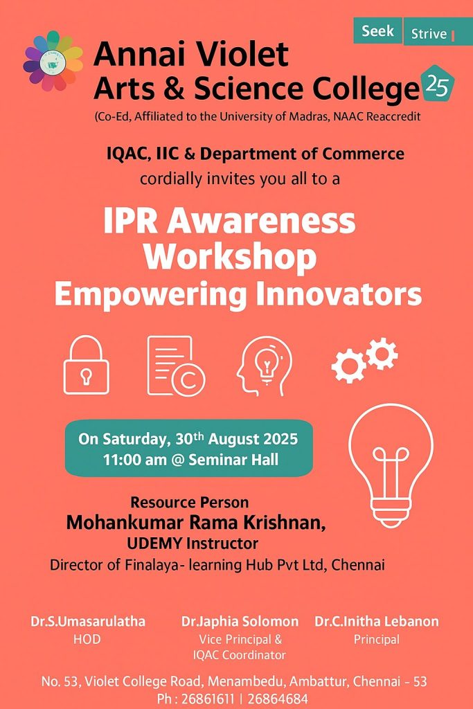 The workshop is organized by IQAC, IIC, and the Department of Commerce at Annai Violet Arts & Science College. It features Mohankumar Rama Krishnan, a UDEMY instructor and Director of Finalaya-learning Hub Pvt Ltd, Chennai, as the resource person. The event is scheduled for Saturday, 30th August 2025, at 11:00 am in the Seminar Hall.