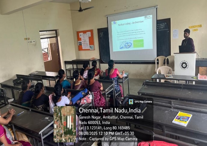 The event was graced by the presence of the Chief Guest, who was warmly felicitated by Dr. R. Harini, Head of the Department of Biochemistry. The resource person, Mr. Monishraj Balaji (B.Sc, MBA, CRC), Team Lead at Medlearn Vision Healthcare Pvt. Ltd., Teynampet, Chennai, delivered an insightful lecture on the importance, scope, and future of medical coding in the context of digital health transformation and artificial intelligence.