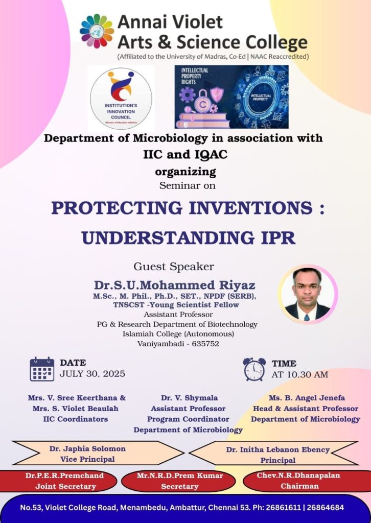 On July 30th, 2025, the IQAC, IIC, and the Department of Microbiology jointly organized a seminar titled “Protecting Innovations: Understanding IPR” at the Mini Seminar Hall, Annai Violet Arts and Science College.