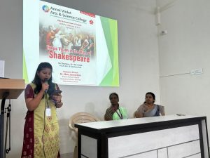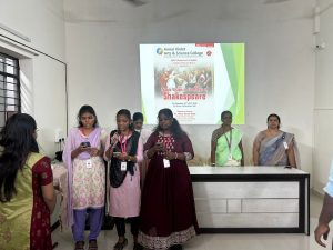The IQAC & Department of English organized a seminar on “Tragic Vision in the Plays of Shakespeare” on 31st July 2025 at 10:30 a.m. in the Seminar Hall. Dr. Mary Surya Kala, Assistant Professor of English at Rajalakshmi Institute of Technology, Kuthambakkam, served as the resource person. Dr. Mary Surya Kala presented a well-structured PowerPoint that explained the tragic flaws (hamartia) of the protagonists, the role of their actions in determining fate, and the influence of morality and ethical choices in shaping the course of events. She highlighted the interplay between free will and destiny, demonstrating how each character’s decisions lead to their downfall. The presentation also explored the intricacies of human nature, ambition, and moral dilemmas as portrayed in Hamlet, Othello, King Lear, and Macbeth. The session concluded with an interactive discussion, where students posed insightful questions on character motivations and the timeless relevance of Shakespeare’s tragic vision.