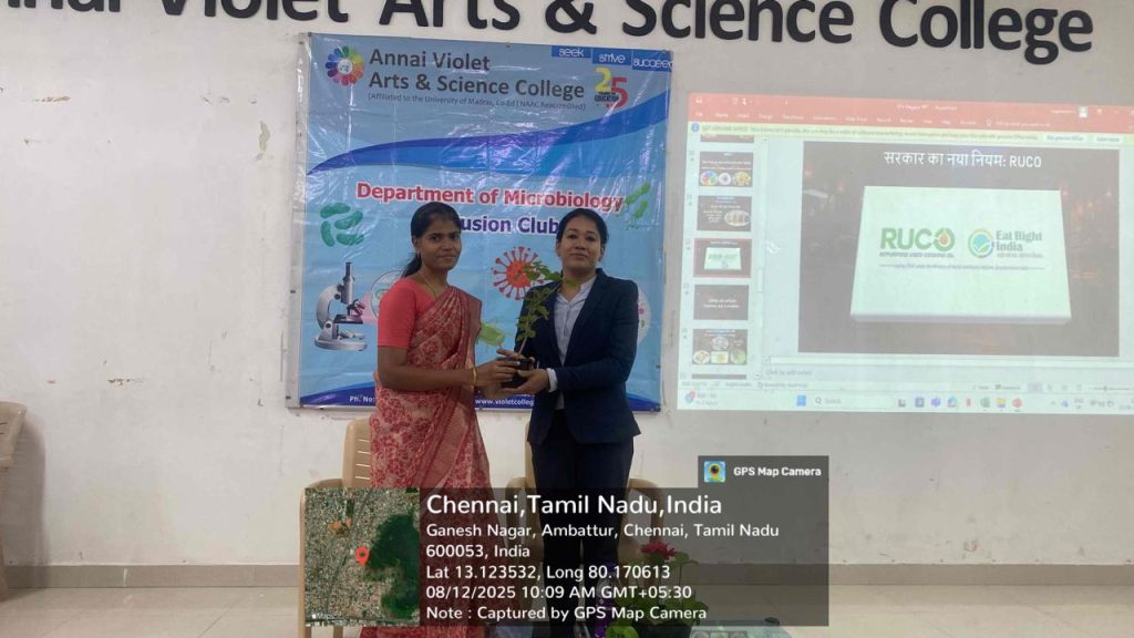 On 12th August 2025, the IQAC and the Department of Microbiology jointly organized a Training Program on Food Safety at the Seminar Hall, Annai Violet Arts & Science College. The resource person, Ms. V. Nagalakshmi, Fast Track Trainer, Parikshan FSS Pvt. Ltd., delivered an insightful presentation on food safety, focusing on building foundational knowledge of food safety standards, identifying common adulterants, and demonstrating simple screening methods, while also reinforcing good hygiene and handling practices for consumers and food handlers.