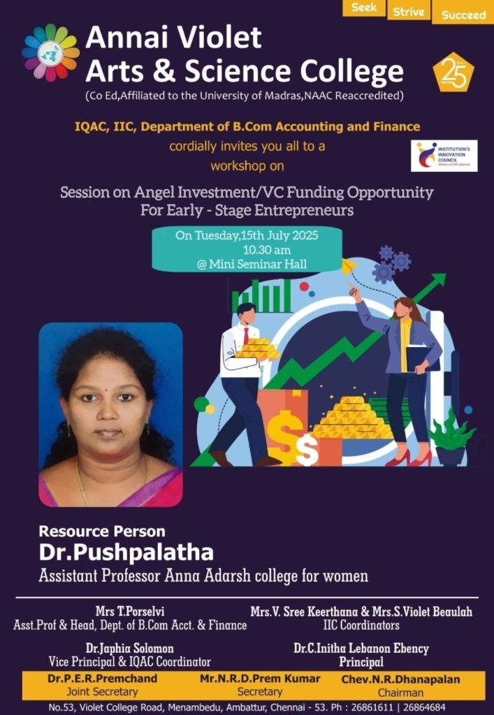The Department of B.Com (Accounting and Finance) of Annai Violet Arts & Science College, in collaboration with IQAC and IIC, organized a seminar on Angel Investment / VC Funding Opportunities for Early-Stage Entrepreneurs on Tuesday, 15th July 2025 at the Mini Seminar Hall. The resource person, Dr. Pushpalatha, Assistant Professor, Anna Adarsh College for Women delivered an insightful session on the role of angel investors and venture capitalists in nurturing start-ups.