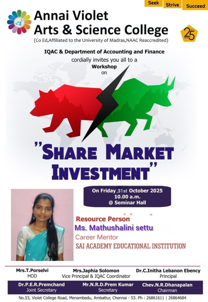 The Department of Accounting and Finance in association with IQAC organized a workshop on “Share Market Investment” on Friday, 31st October 2025 at 10:00 a.m.The session was handled by Ms. Mathushalini Settu, Career Mentor from SAI Academy Educational Institution.The resource person provided valuable insights on the fundamentals of stock markets, trading mechanisms, risk management, and the importance of long-term investment strategies. The workshop helped students understand how the stock market operates and guided them on how to make informed financial decisions.