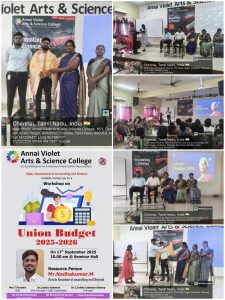 A workshop was organized by the Department of BCom Accounting and Finance (Fino Club) and IQAC on 17th September 2025, and included participation from I, II, and III-year students. The event featured Mr. Nanda Kumar M, Article Assistant at Consulting & Beyond (2023–2025), Tax Department as the expert speaker. The workshop included detailed presentations and interactive sessions on the latest critical thinking on how budgetary decisions impact individuals, businesses, and national development.